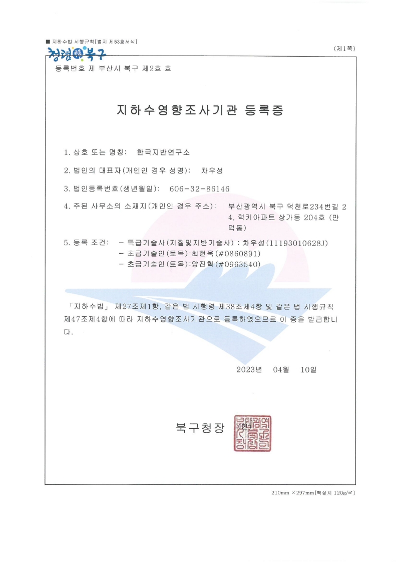 • 2023년 04월 : 지하수영향조사기관 등록
